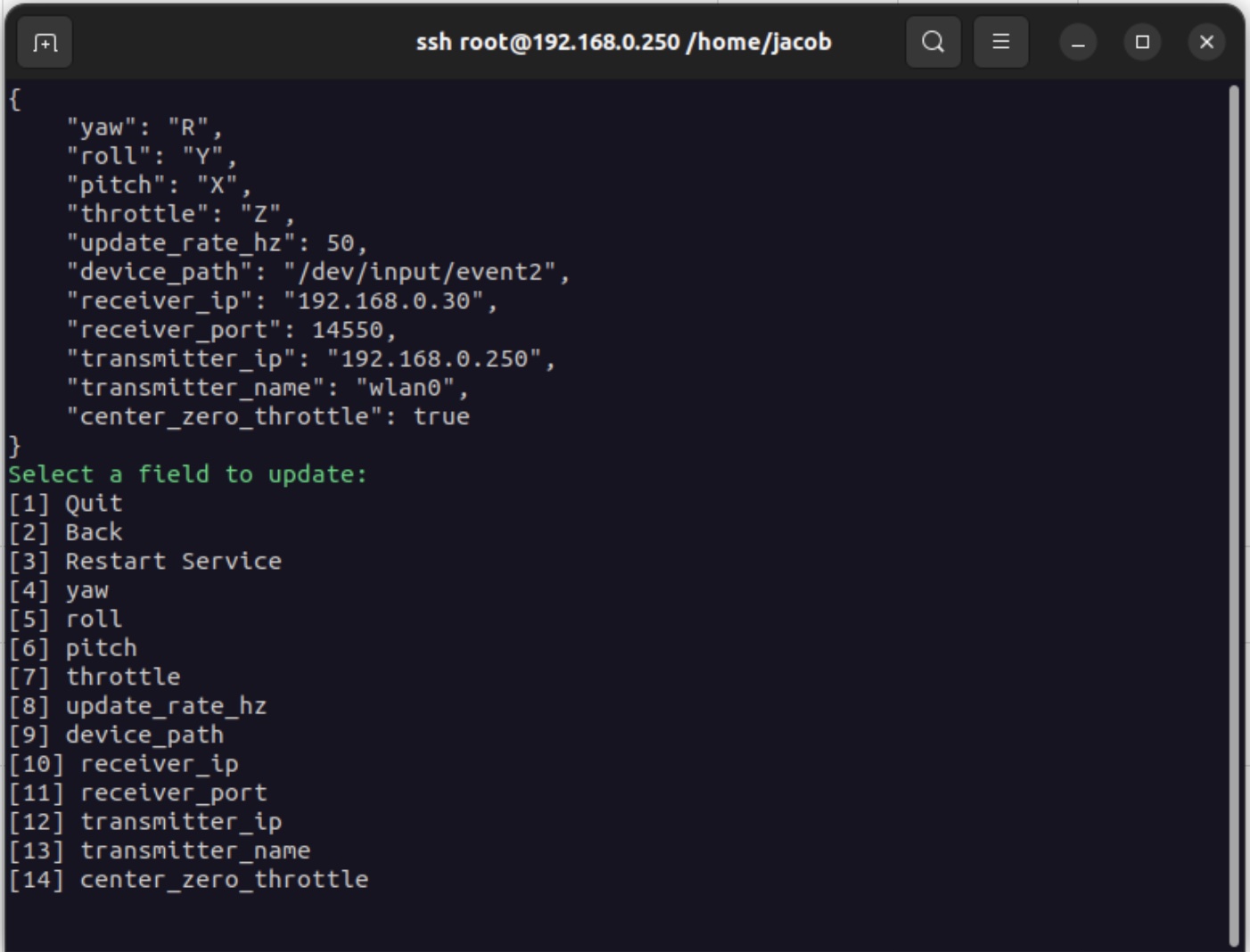 - Transmitter: transmitter_ip should be the IP address of this device (the VRX). transmitter_name should be the name of the network interface to be used for transmitting the data (likely wlan0, tailscale0, or wwan0)